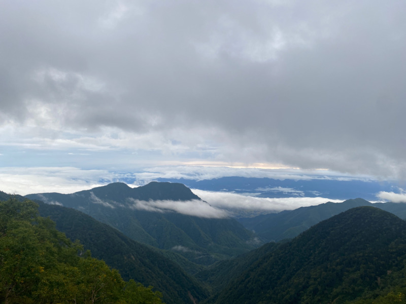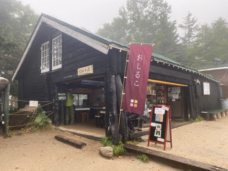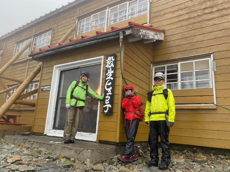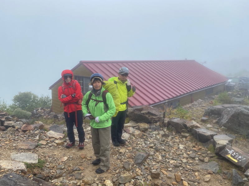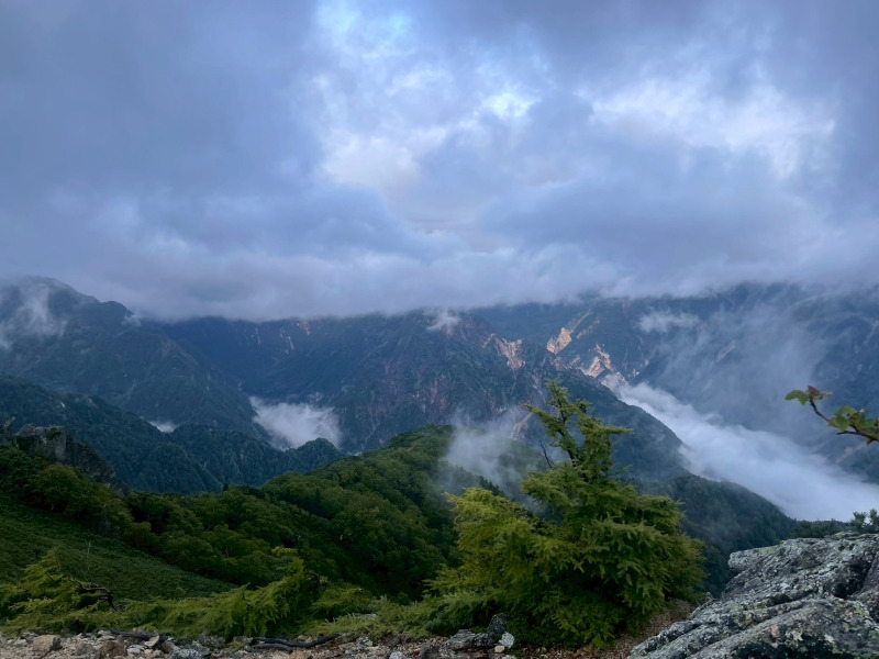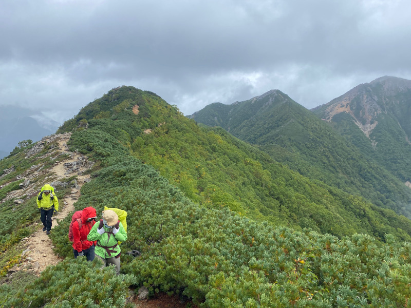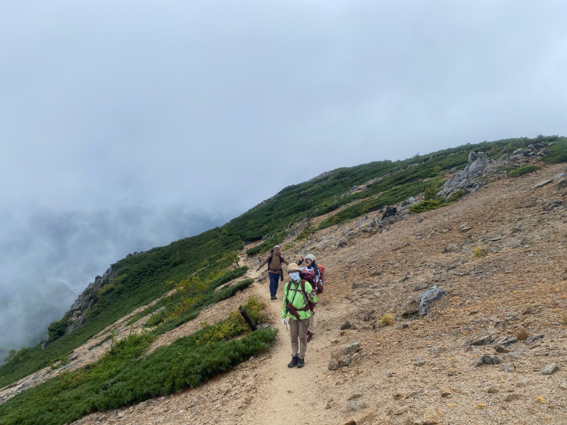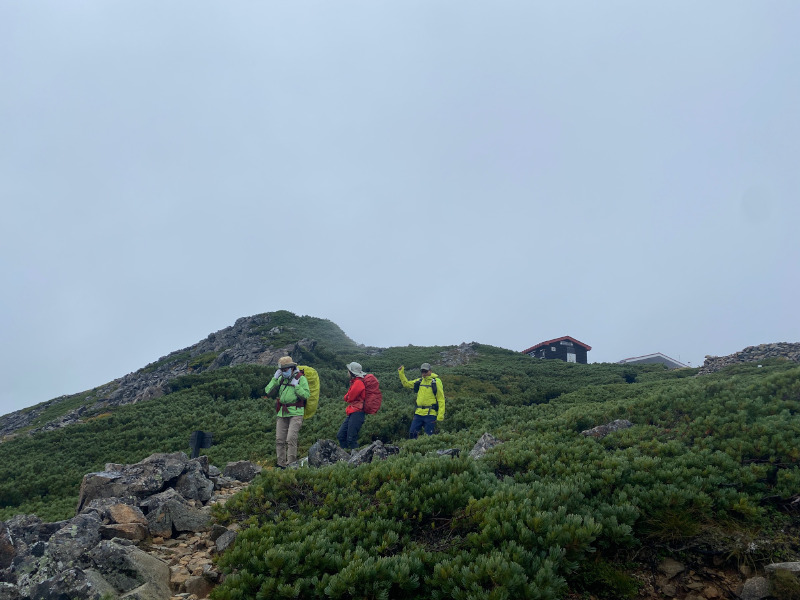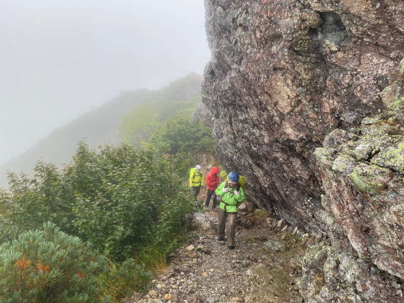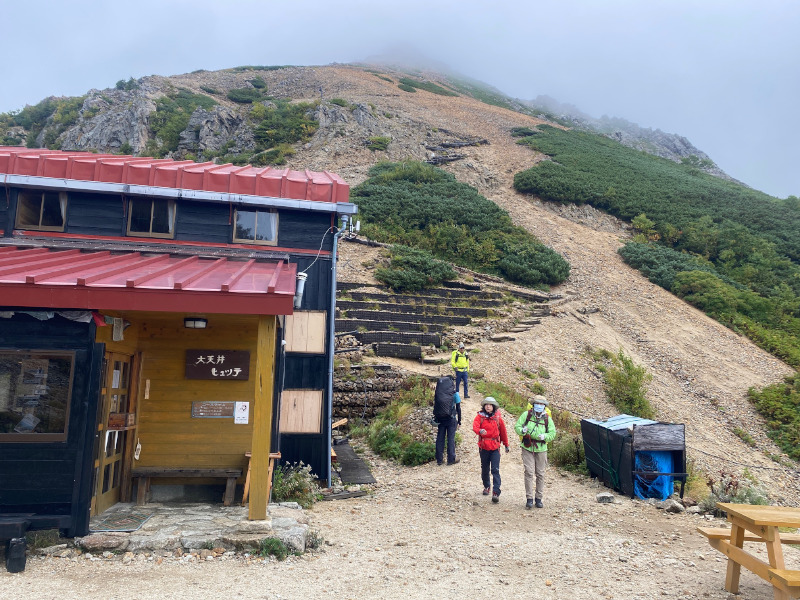 大天井岳の南側をトラバースするように回り込み、40分ほどで大天井ヒュッテに下りました。時折雨が降っていますが、レインパンツを履くほどではありません。ここから次の中継地点であるヒュッテ西岳まで、約3時間の喜作新道の歩きとなります。