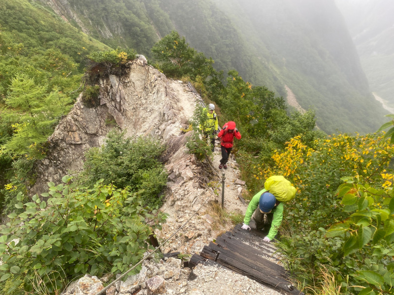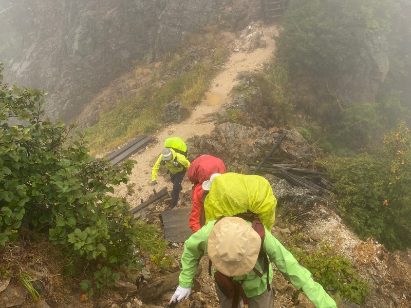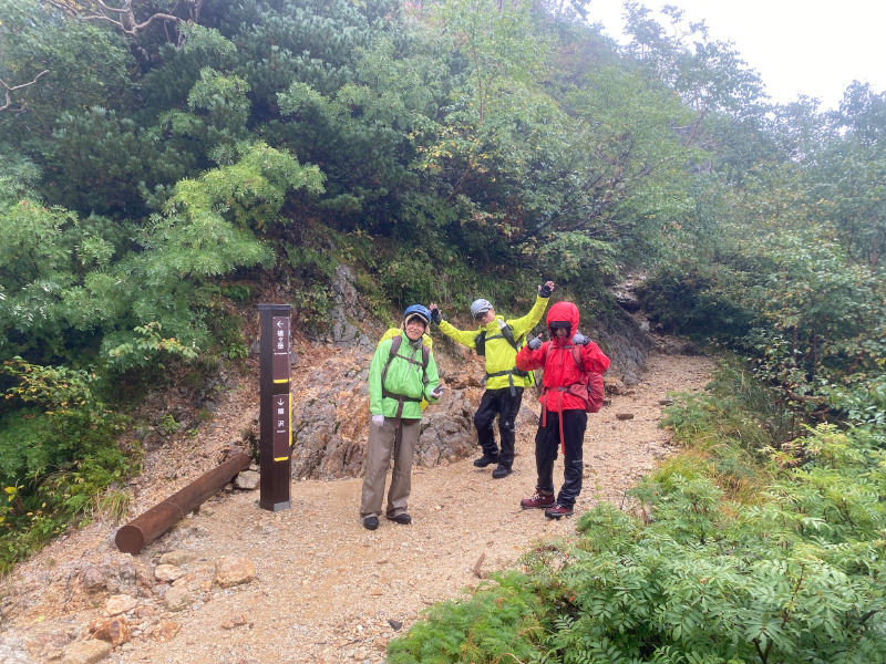 9月12日(金)、午前中に大糸線穂高駅に集合し、バスで中房温泉に向かいました。4月発生した道路の路肩崩落による通行止めは、関係者様の努力で8月には解除されて無事通過することが出来ました。雨が降りそうな気配でしたので、ザックカバーを付けレインウエアを着て12時過ぎに出発しました。