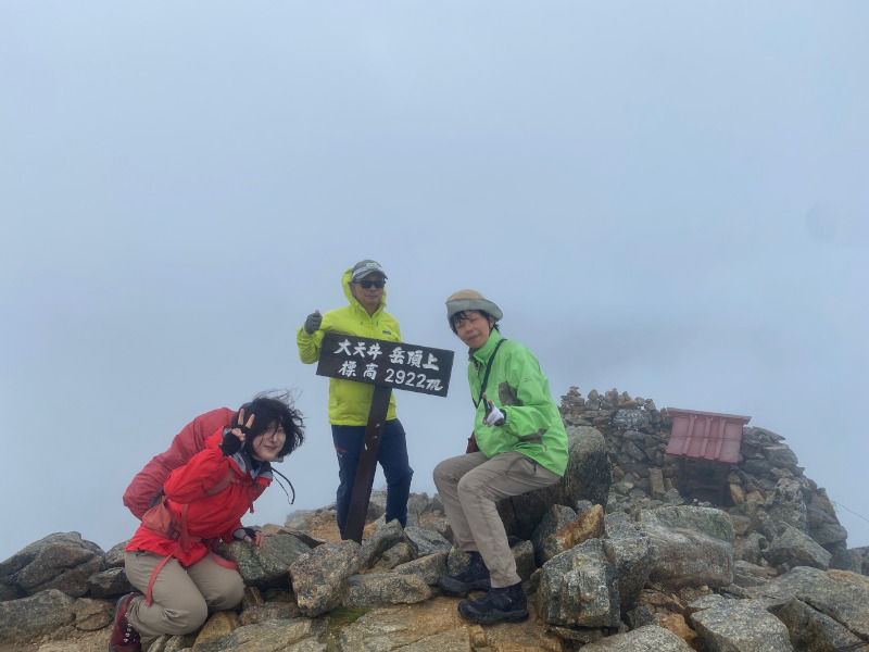 大天荘に荷物をデポして大天井岳に登りました。時折視界が開けますが、強い風がすぐに雲を運んできてしまいます。日本百名山である大天井岳(おてんしょうだけ)は常念山脈の最高峰で標高は2,922 メートルあります。