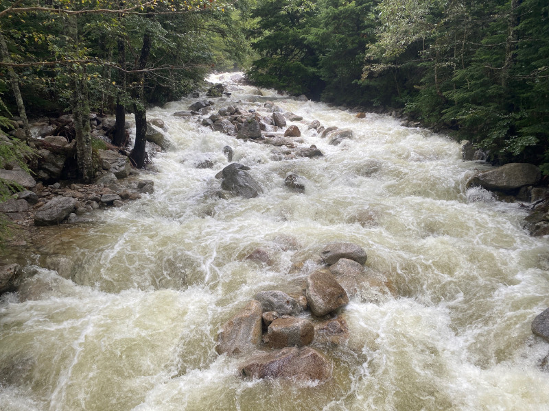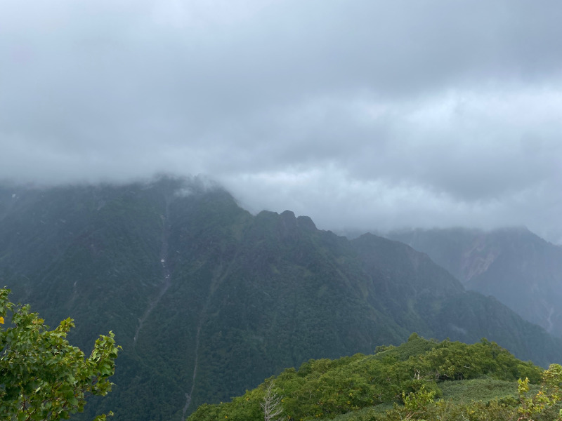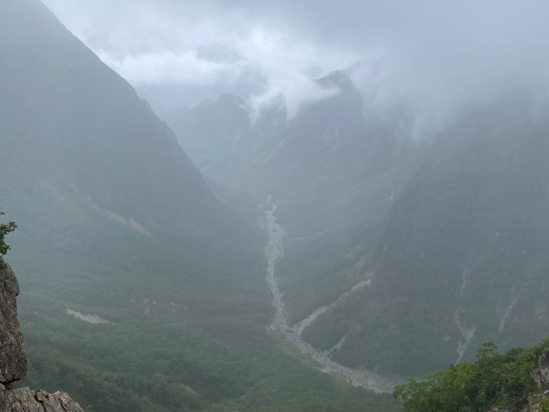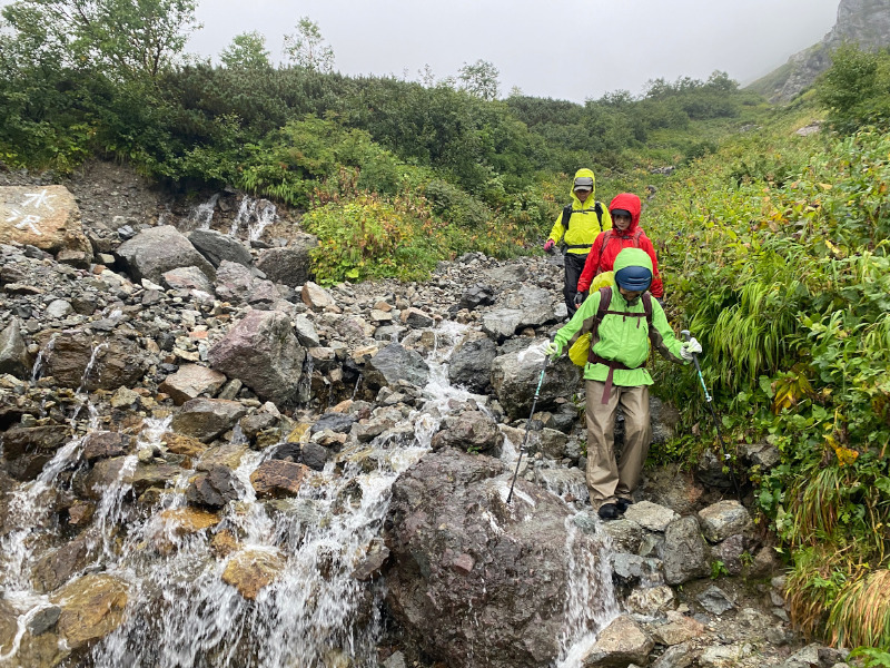 3日目の朝、槍ヶ岳登頂の予定でしたが、強い風雨のため、登ることは断念して下山することとしました。長い時間とどまると沢の増水も懸念されるため、早めの下山が得策という判断です。朝食を小屋でいただき、準備出来次第、下山開始です。昨日歩いた東鎌尾根から幾筋もの滝が見えます。