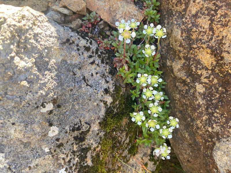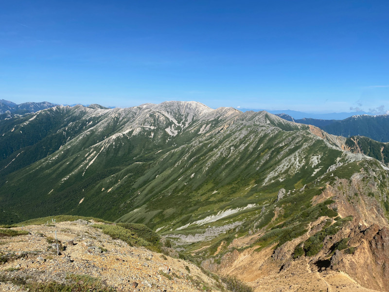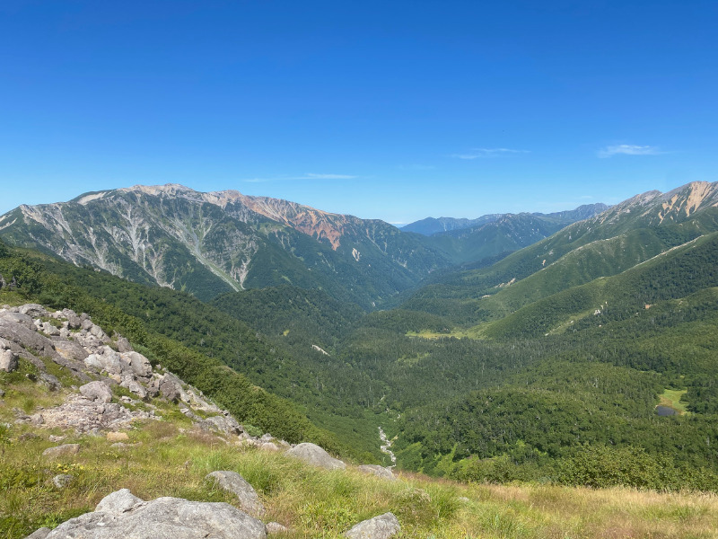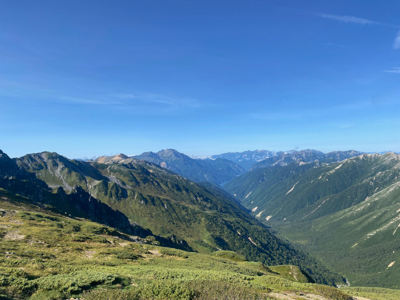 水晶小屋へのルートに戻って、祖父岳(じいだけ)に登りました。祖父岳からの眺望は本当に素晴らしく、360度、どちらを向いても絶景を楽しめます。黒部源流の谷の向こうには三俣蓮華岳、鷲羽岳、その向こうに双六岳、さらに槍ヶ岳と穂高連峰。しばらくのあいだ、山頂の展望を楽しみました。