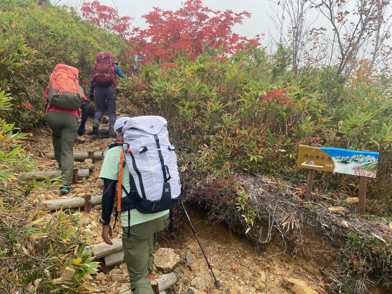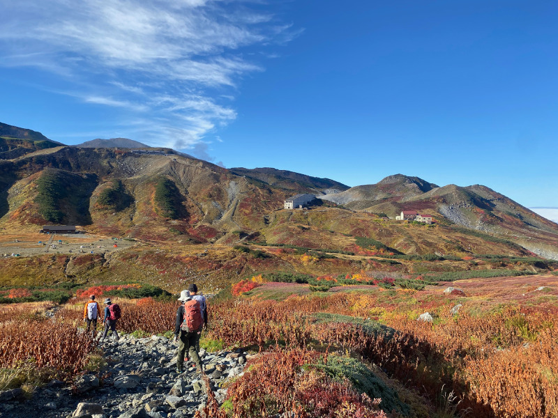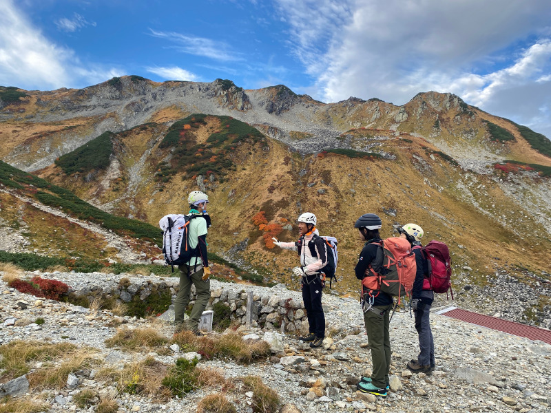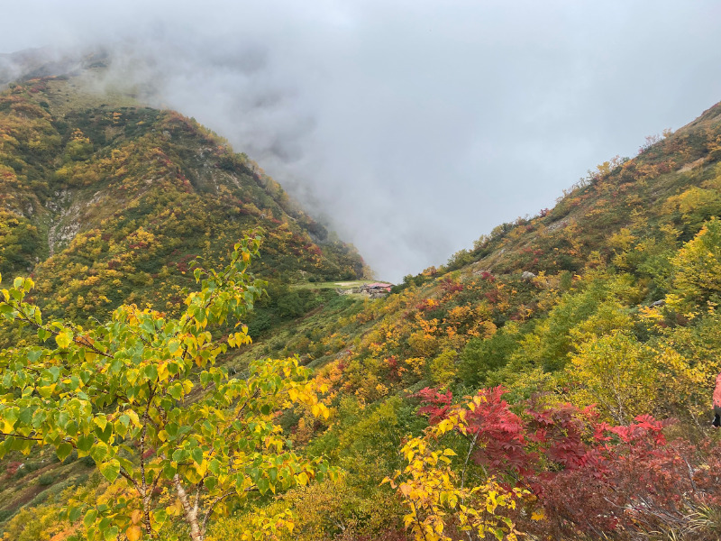 今日の泊地である剱御前小屋に向かいます。雷鳥沢に下っていくと、立山らしい美しい草紅葉が広がります。イワイチョウの黄色、チングルマの赤のコントラストが天然の絨毯となって山裾まで広がっていきます。今年の紅葉は当たり年のようですね。