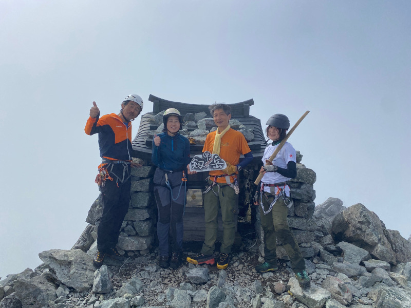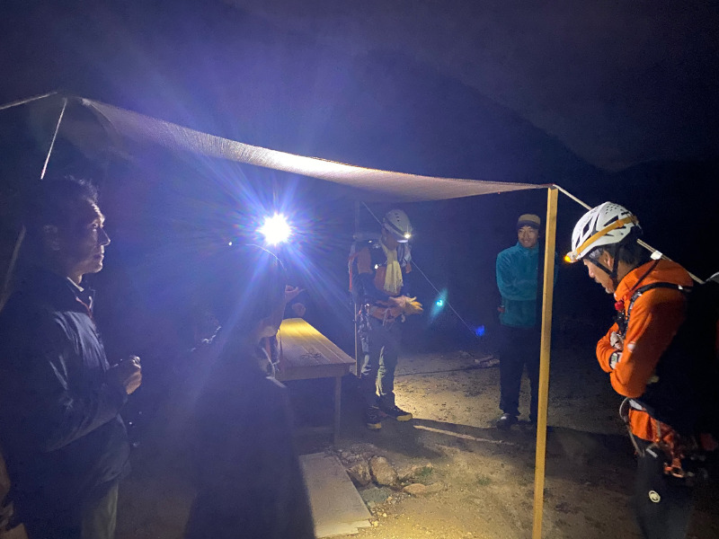剱澤小屋のすぐ横にある「六字塚」と呼ばれる慰霊碑に立ち寄り、剱沢小屋雪崩事故の話を聞きました。1930年に帝大0Bら6人が大規模な雪崩に遭い遭難した事故で参加パーティー6名全員が亡くなったとのことです。