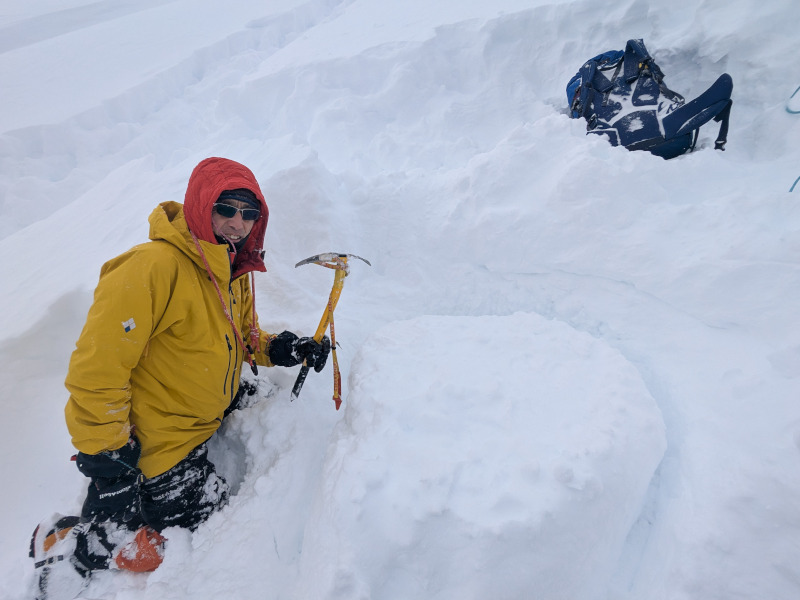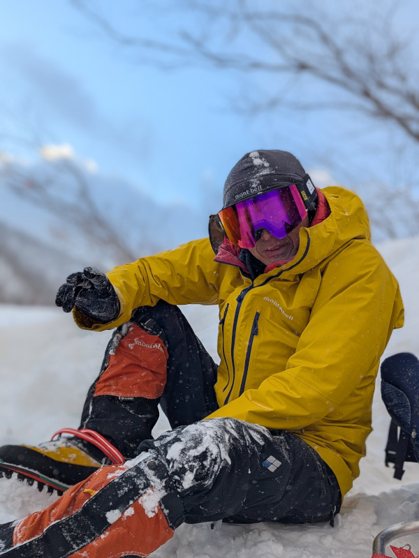 スタンディングアックスビレイは、踏み固めた雪上にピッケルを突き刺し、そこをアンカーとして、ロープで後続の方をビレイする際によく用いられます。講習では、作成時及びビレイ時のコツを説明しながら、実際に滑落したガイドを止めてもらう練習を行いました。
