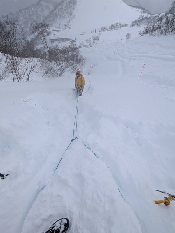 スノーポラードは、踏み固めた雪を支点として懸垂下降などに利用する技術です。作成時の注意点を説明しながら、作成してもらい、最後は、ご自身でその安全性を確かめてもらいました。仮に崩壊しても、下はふかふかの雪ですので安全です。